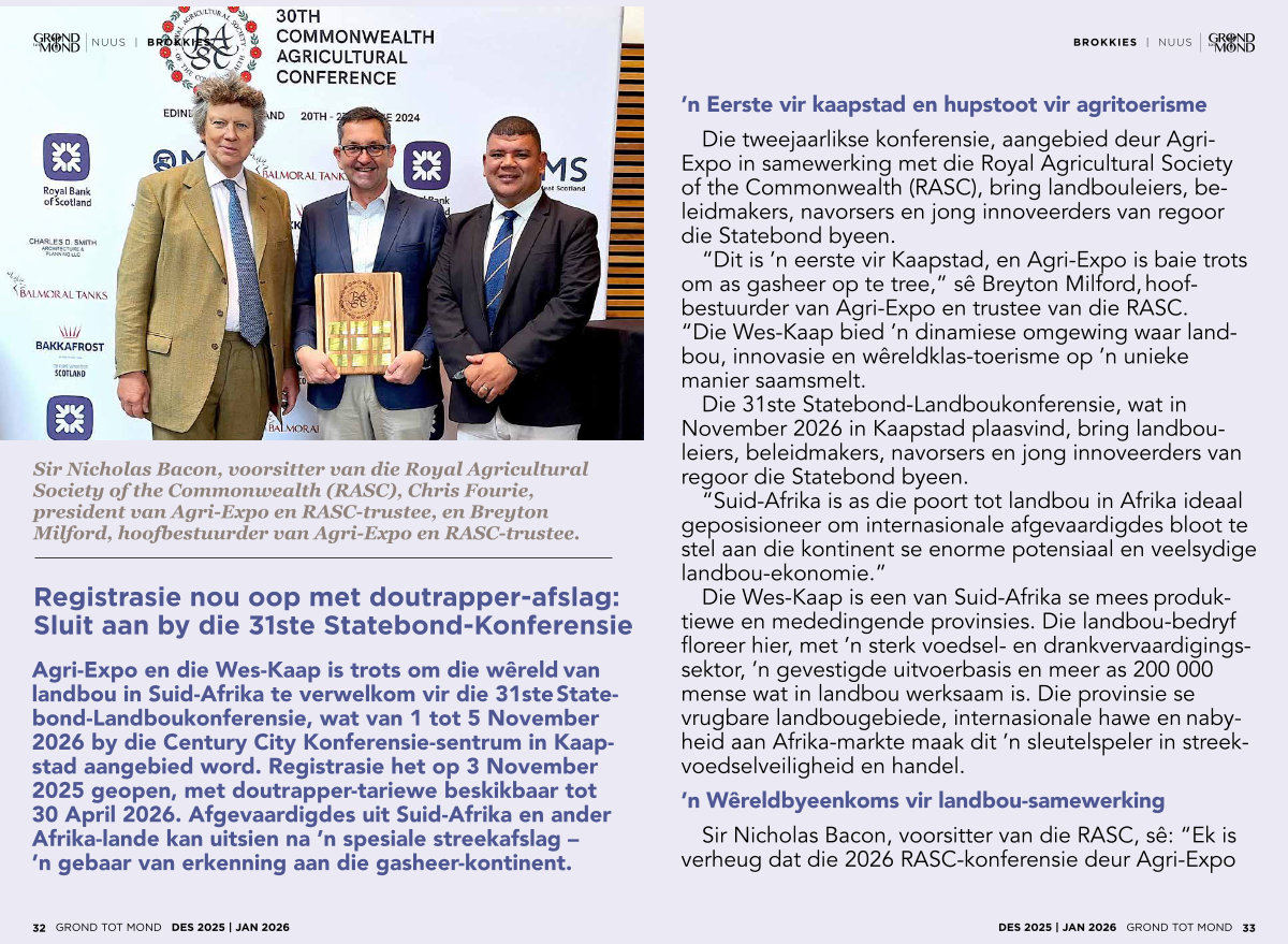 Agri-Expo en die Wes-Kaap is trots om die wêreld van landbou in Suid-Afrika te verwelkom vir die 31steStatebond-Landboukonferensie, wat van 1 tot 5 November 2026 by die Century City Konferensie-sentrum in Kaapstad aangebied word. Registrasie het op 3 November 2025 geopen, met doutrapper-tariewe beskikbaar tot 30 April 2026. Afgevaardigdes uit Suid-Afrika en ander Afrika-lande kan uitsien na’ n spesiale streekafslag –’ n gebaar van erkenning aan die gasheer-kontinent.