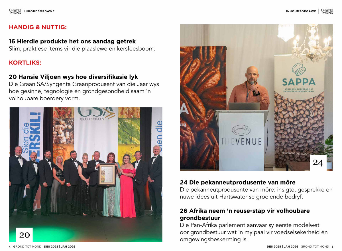 24 Die pekanneutprodusente van môre Die pekanneutprodusente van môre: insigte, gesprekke en nuwe idees uit Hartswater se groeiende bedryf.