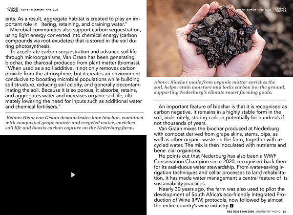 Below: Henk van Graan demonstrates how biochar, combined with composted grape matter and recycled water, enriches soil life and boosts carbon capture on the Nederburg farm.