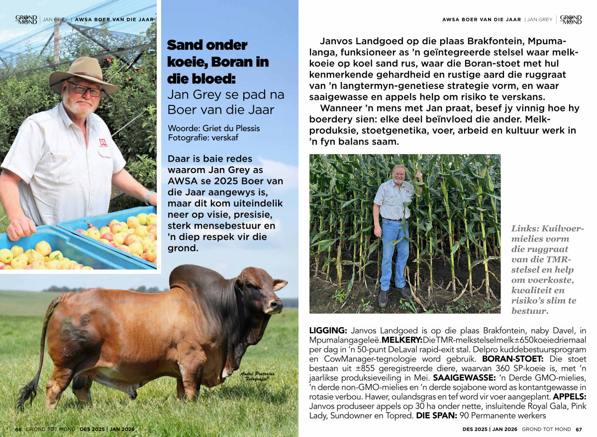 Daar is baie redes waarom Jan Grey as AWSA se 2025 Boer van die Jaar aangewys is, maar dit kom uiteindelik neer op visie, presisie, sterk mensebestuur en’ n diep respek vir die grond.