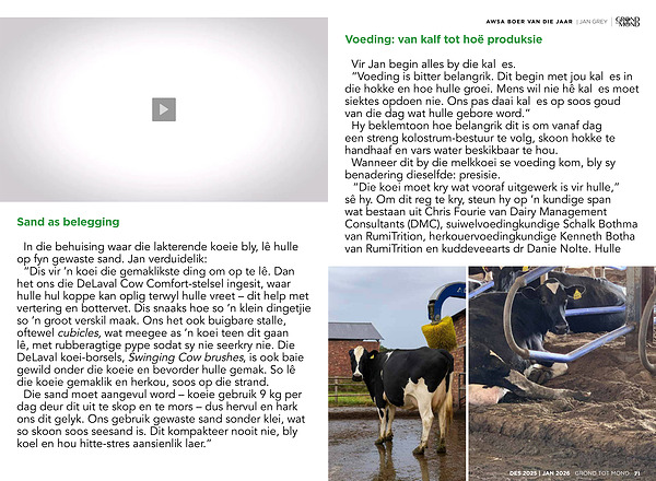 In die behuising waar die lakterende koeie bly, lê hulle op fyn gewaste sand. Jan verduidelik:“ Dis vir’ n koei die gemaklikste ding om op te lê. Dan het ons die DeLaval Cow Comfort-stelsel ingesit, waar hulle hul koppe kan oplig terwyl hulle vreet – dit help met vertering en bottervet. Dis snaaks hoe so’ n klein dingetjie so’ n groot verskil maak. Ons het ook buigbare stalle, oftewel cubicles, wat meegee as’ n koei teen dit gaan lê, met rubberagtige pype sodat sy nie seerkry nie. Die DeLaval koei-borsels, Swinging Cow brushes, is ook baie gewild onder die koeie en bevorder hulle gemak. So lê die koeie gemaklik en herkou, soos op die strand. Die sand moet aangevul word – koeie gebruik 9 kg per dag deur dit uit te skop en te mors – dus hervul en hark ons dit gelyk. Ons gebruik gewaste sand sonder klei, wat so skoon soos seesand is. Dit kompakteer nooit nie, bly koel en hou hitte-stres aansienlik laer.”