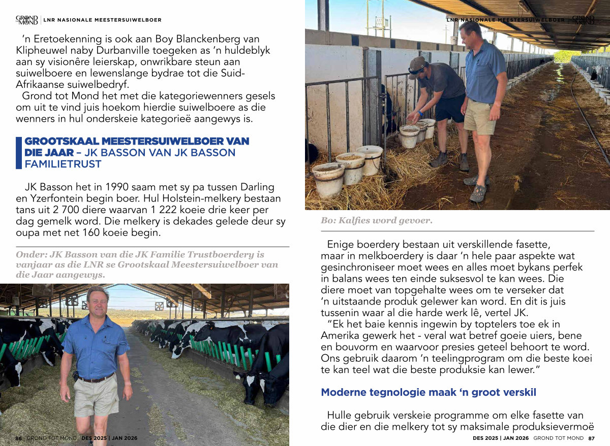 Enige boerdery bestaan uit verskillende fasette, maar in melkboerdery is daar‘ n hele paar aspekte wat gesinchroniseer moet wees en alles moet bykans perfek in balans wees ten einde suksesvol te kan wees. Die diere moet van topgehalte wees om te verseker dat‘ n uitstaande produk gelewer kan word. En dit is juis tussenin waar al die harde werk lê, vertel JK.“ Ek het baie kennis ingewin by toptelers toe ek in Amerika gewerk het- veral wat betref goeie uiers, bene en bouvorm en waarvoor presies geteel behoort te word. Ons gebruik daarom‘ n teelingprogram om die beste koei te kan teel wat die beste produksie kan lewer.”