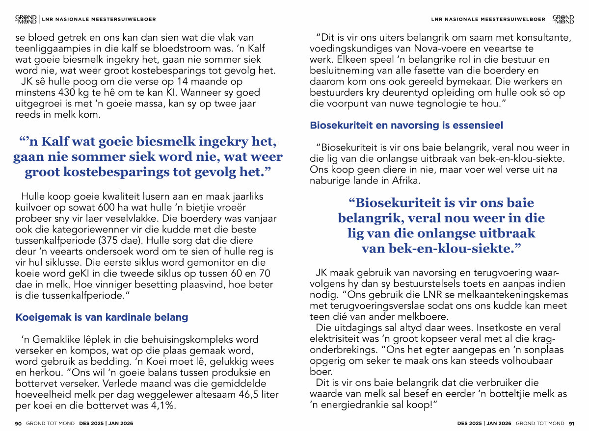 “ Dit is vir ons uiters belangrik om saam met konsultante, voedingskundiges van Nova-voere en veeartse te werk. Elkeen speel‘ n belangrike rol in die bestuur en besluitneming van alle fasette van die boerdery en daarom kom ons ook gereeld bymekaar. Die werkers en bestuurders kry deurentyd opleiding om hulle ook só op die voorpunt van nuwe tegnologie te hou.”