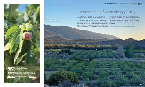 EIENAAR : Jaco en Liezl de Klerk NAAM : Weltevrede Fig & Guest Farm AREA : Prins Albert , Wes-Kaap PRODUK : Vye en akkommodasie OPSOMMING : Jaco en Liezl de Klerk bou voort op die tradisies wat deur hul voorsate neergelĂȘ is en geniet die soet smaak van sukses uit vars vrugte en konfyt . KONTAK : weltevrede @ figfarm . co . za | figfarm . co . za