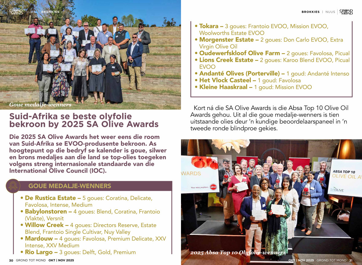 Kort ná die SA Olive Awards is die Absa Top 10 Olive Oil Awards gehou. Uit al die goue medalje-wenners is tien uitstaande olies deur’ n kundige beoordelaarspaneel in’ n tweede ronde blindproe gekies.