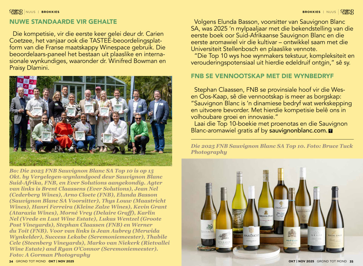 Volgens Elunda Basson, voorsitter van Sauvignon Blanc SA, was 2025’ n mylpaaljaar met die bekendstelling van die eerste boek oor Suid-Afrikaanse Sauvignon Blanc en die eerste aromawiel vir die kultivar – ontwikkel saam met die Universiteit Stellenbosch en plaaslike vennote.“ Die Top 10 wys hoe wynmakers tekstuur, kompleksiteit en verouderingspotensiaal uit hierdie edeldruif ontgin,” sê sy.