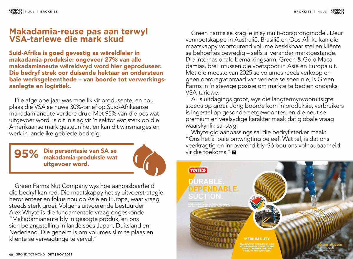Die afgelope jaar was moeilik vir produsente, en nou plaas die VSA se nuwe 30 %-tarief op Suid-Afrikaanse makadamianeute verdere druk. Met 95 % van die oes wat uitgevoer word, is dit’ n slag vir’ n sektor wat sterk op die Amerikaanse mark gesteun het en kan dit winsmarges en werk in landelike gebiede bedreig.