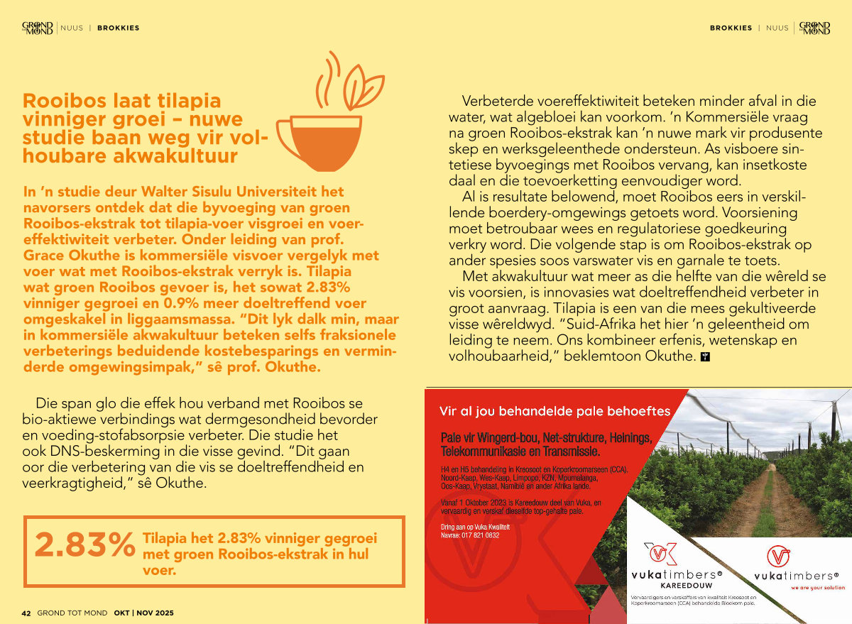 Met akwakultuur wat meer as die helfte van die wêreld se vis voorsien, is innovasies wat doeltreffendheid verbeter in groot aanvraag. Tilapia is een van die mees gekultiveerde visse wêreldwyd.“ Suid-Afrika het hier’ n geleentheid om leiding te neem. Ons kombineer erfenis, wetenskap en volhoubaarheid,” beklemtoon Okuthe.