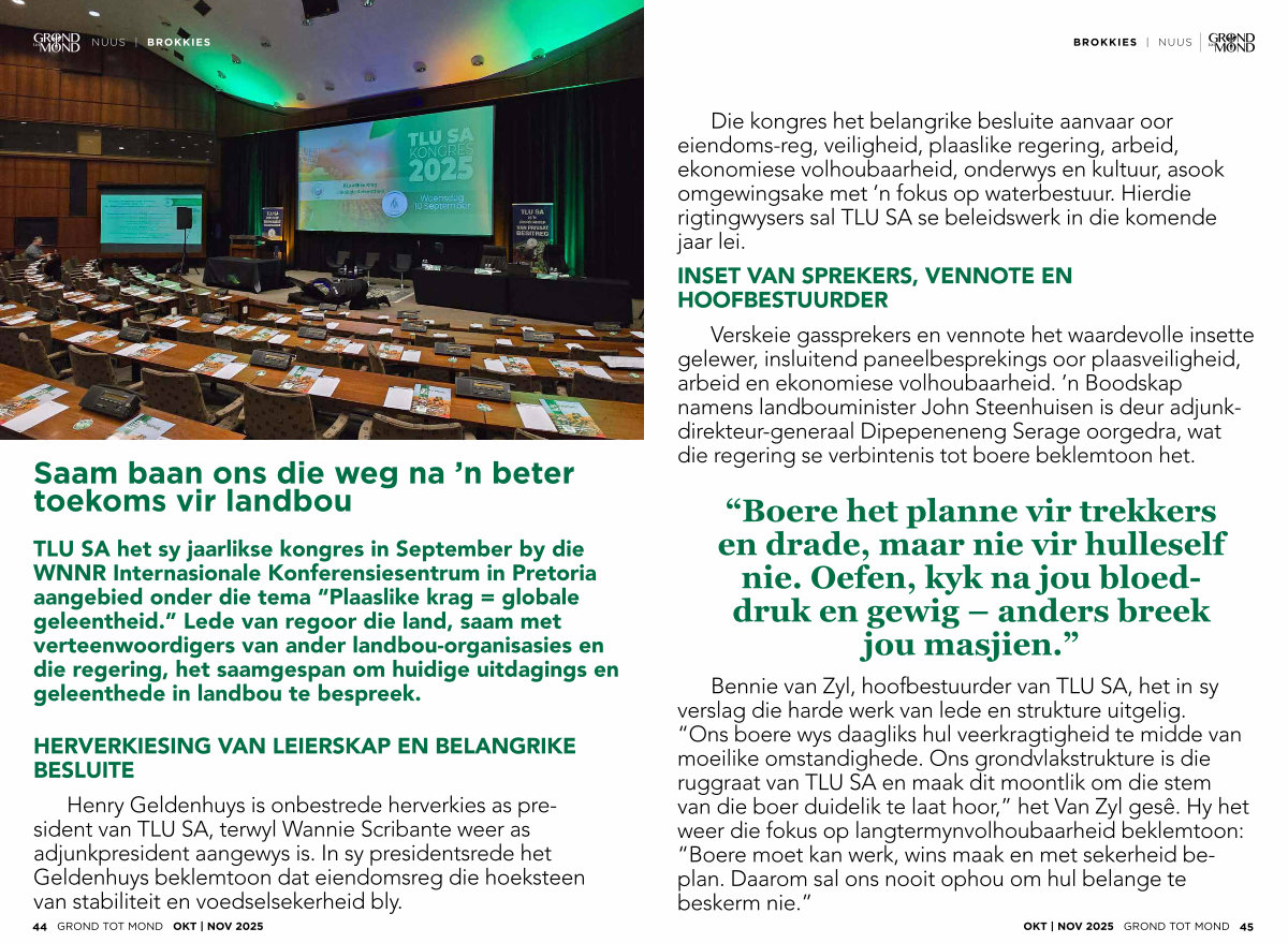 Bennie van Zyl, hoofbestuurder van TLU SA, het in sy verslag die harde werk van lede en strukture uitgelig.“ Ons boere wys daagliks hul veerkragtigheid te midde van moeilike omstandighede. Ons grondvlakstrukture is die ruggraat van TLU SA en maak dit moontlik om die stem van die boer duidelik te laat hoor,” het Van Zyl gesê. Hy het weer die fokus op langtermynvolhoubaarheid beklemtoon:“ Boere moet kan werk, wins maak en met sekerheid beplan. Daarom sal ons nooit ophou om hul belange te beskerm nie.”