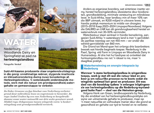 Suid-Afrikaanse produsente staar ongekendeuitdagings in die gesig: onreëlmatige reënval, stygende insetkoste en klimaatverandering dwing nuwe benaderings af. Herlewingslandbou,’ n wetenskaplik ondersteunde metode, werk met die natuur om grondgesondheid, watergehalte en gemeenskappe te verbeter.