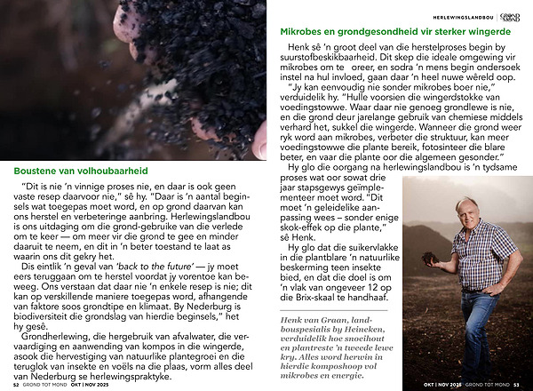 Dis eintlik’ n geval van‘ back to the future’— jy moet eers teruggaan om te herstel voordat jy vorentoe kan beweeg. Ons verstaan dat daar nie’ n enkele resep is nie; dit kan op verskillende maniere toegepas word, afhangende van faktore soos grondtipe en klimaat. By Nederburg is biodiversiteit die grondslag van hierdie beginsels,” het hy gesê.