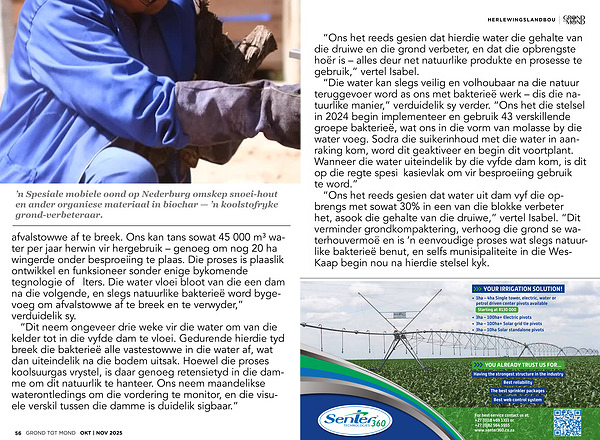 afvalstowwe af te breek. Ons kan tans sowat 45 000 m ³ water per jaar herwin vir hergebruik – genoeg om nog 20 ha wingerde onder besproeiing te plaas. Die proses is plaaslik ontwikkel en funksioneer sonder enige bykomende tegnologie of filters. Die water vloei bloot van die een dam na die volgende, en slegs natuurlike bakterieë word bygevoeg om afvalstowwe af te breek en te verwyder,” verduidelik sy.