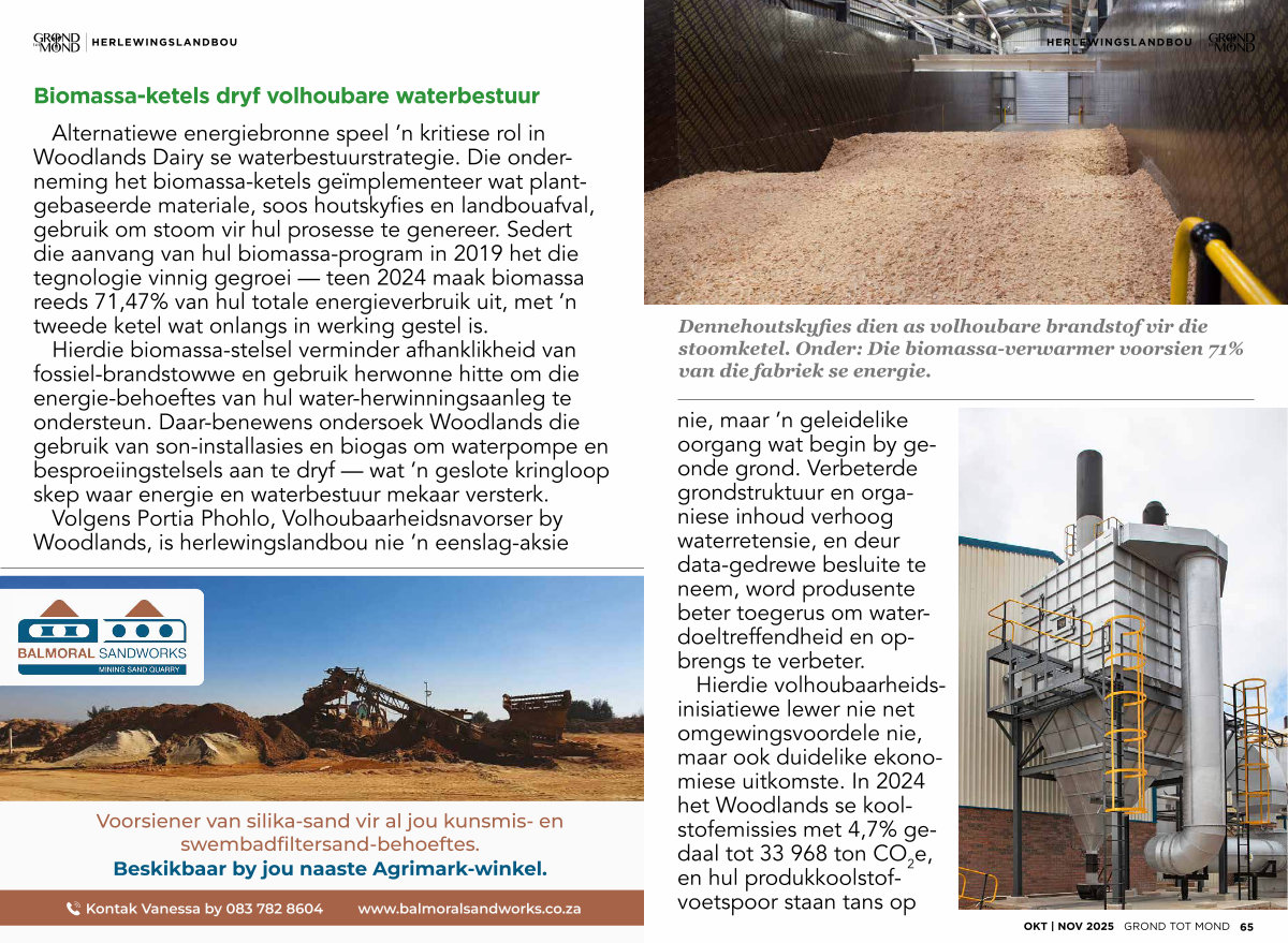 Alternatiewe energiebronne speel’ n kritiese rol in Woodlands Dairy se waterbestuurstrategie. Die onderneming het biomassa-ketels geïmplementeer wat plantgebaseerde materiale, soos houtskyfies en landbouafval, gebruik om stoom vir hul prosesse te genereer. Sedert die aanvang van hul biomassa-program in 2019 het die tegnologie vinnig gegroei— teen 2024 maak biomassa reeds 71,47 % van hul totale energieverbruik uit, met’ n tweede ketel wat onlangs in werking gestel is.