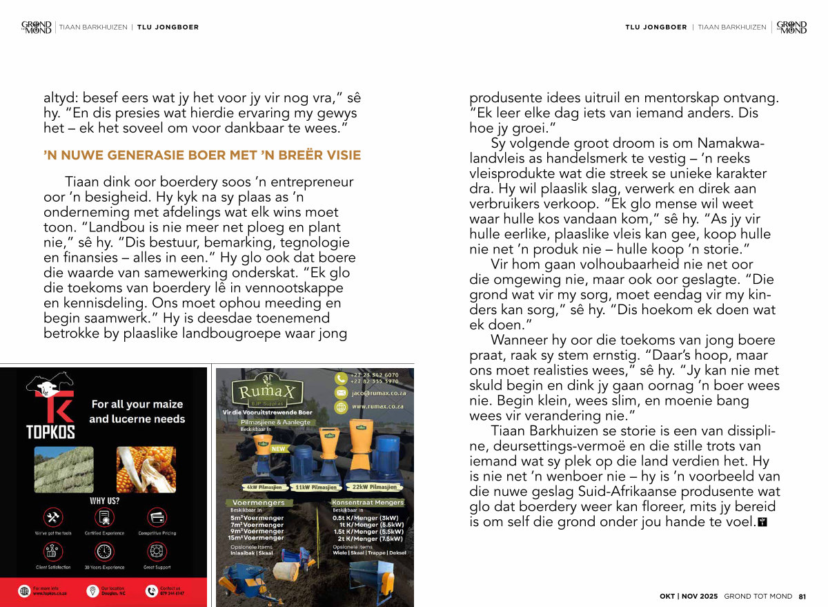 Tiaan Barkhuizen se storie is een van dissipline, deursettings-vermoë en die stille trots van iemand wat sy plek op die land verdien het. Hy is nie net’ n wenboer nie – hy is’ n voorbeeld van die nuwe geslag Suid-Afrikaanse produsente wat glo dat boerdery weer kan floreer, mits jy bereid is om self die grond onder jou hande te voel.