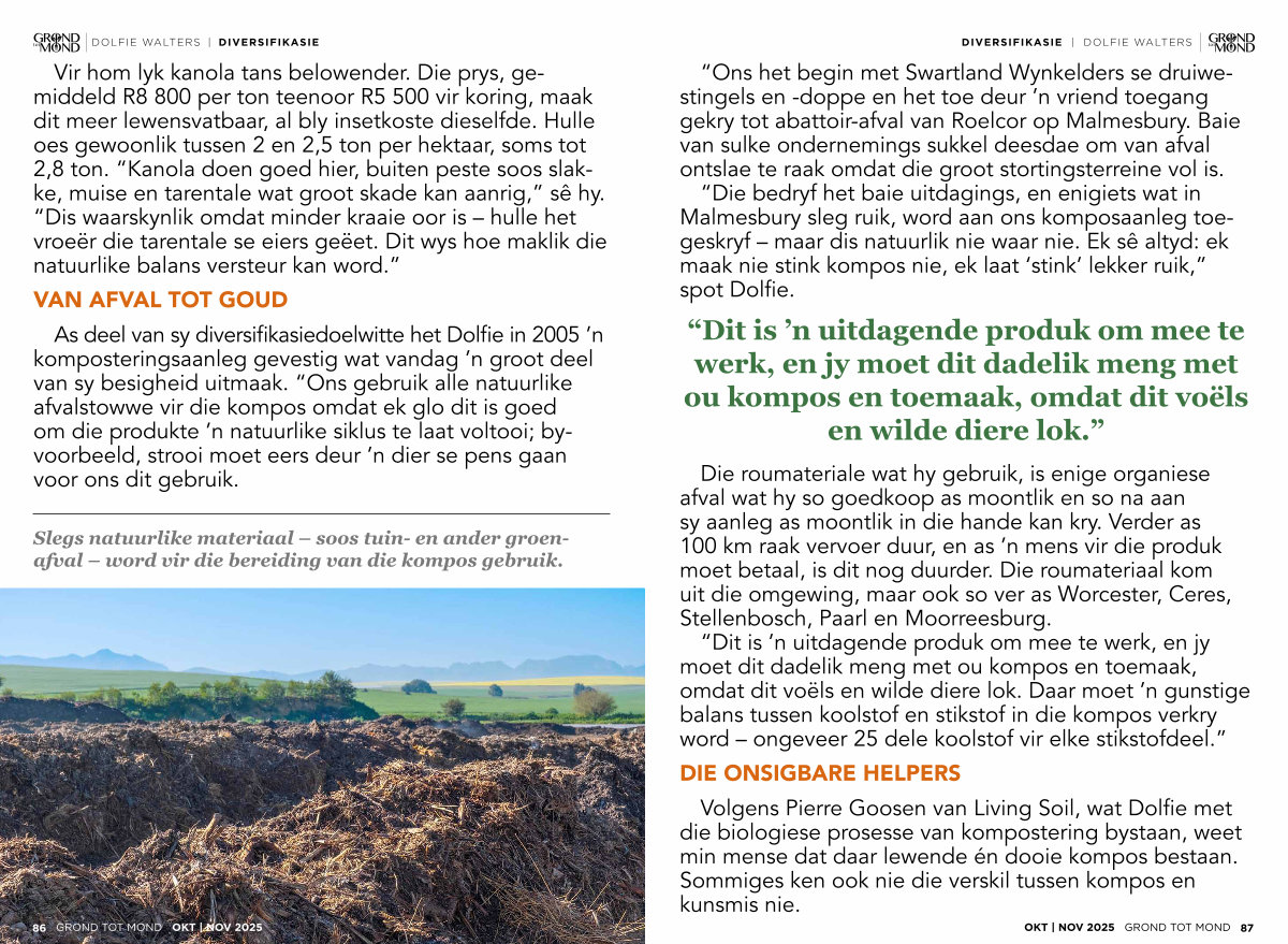 “ Ons het begin met Swartland Wynkelders se druiwestingels en-doppe en het toe deur’ n vriend toegang gekry tot abattoir-afval van Roelcor op Malmesbury. Baie van sulke ondernemings sukkel deesdae om van afval ontslae te raak omdat die groot stortingsterreine vol is.“ Die bedryf het baie uitdagings, en enigiets wat in Malmesbury sleg ruik, word aan ons komposaanleg toegeskryf – maar dis natuurlik nie waar nie. Ek sê altyd: ek maak nie stink kompos nie, ek laat‘ stink’ lekker ruik,” spot Dolfie.