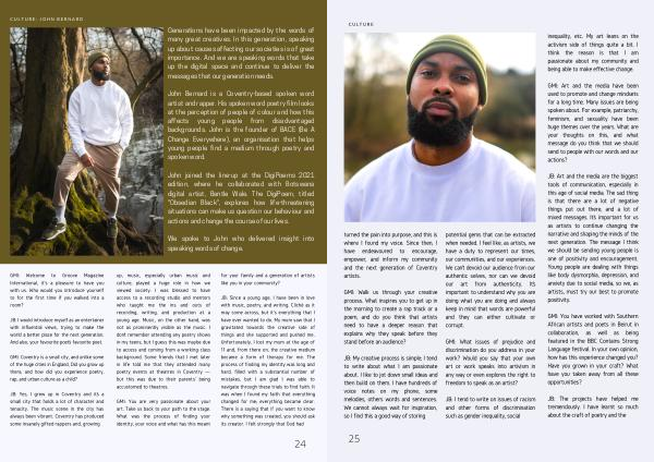 John joined the line-up at the DigiPoems 2021 edition , where he collaborated with Botswana digital artist , Bantle Wale . The DigiPoem , titled " Obsedian Black ", explores how life-threatening situations can make us question our behaviour and actions and change the course of our lives .