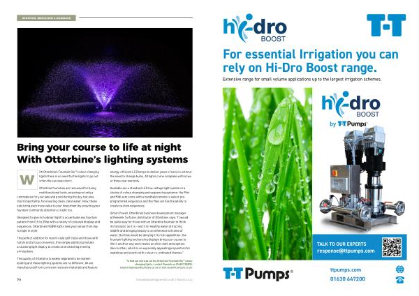 Simon Powell , Otterbine ’ s business development manager at Reesink Turfcare , distributor of Otterbine , says : “ It would be quite easy for those with an Otterbine fountain to think it ’ s fantastic as it is – and it is ! Healthy water attracting wildlife and bringing beauty to an otherwise still area of water . But that would be denying it its full capabilities ; the fountain lighting enchancing displays bring your course to life in another way and creates an after-dark atmosphere like no other , which is an especially appealing proposition for weddings and events with colour co-ordinated themes .”