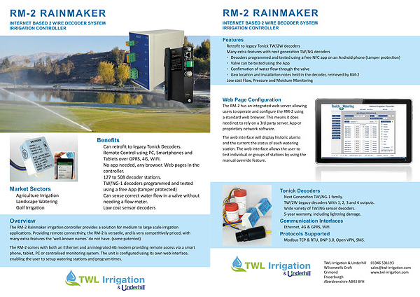 The RM-2 Rainmaker irrigation controller provides a solution for medium to large scale irrigation applications . Providing remote connectivity , the RM-2 is versatile , and is very competitively priced , with many extra features the ‘ well-known names ’ do not have . ( some patented )