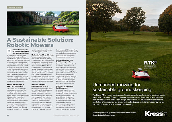 E mission-Free Turf Care for Groundskeepers and Sports Turf Professionals As sustainability becomes a key priority for sports grounds , and large turf areas , groundskeepers are seeking efficient , cost-effective ways to maintain high-quality playing surfaces while reducing their carbon footprint . Robotic mowers provide an innovative solution , combining cutting-edge technology with zero emissions for environmentally responsible turf care . For example , Kress RTKn robotic mowers lead the way in this evolution , offering antenna-free , high-precision mowing with reliable performance tailored for sports turf management .
