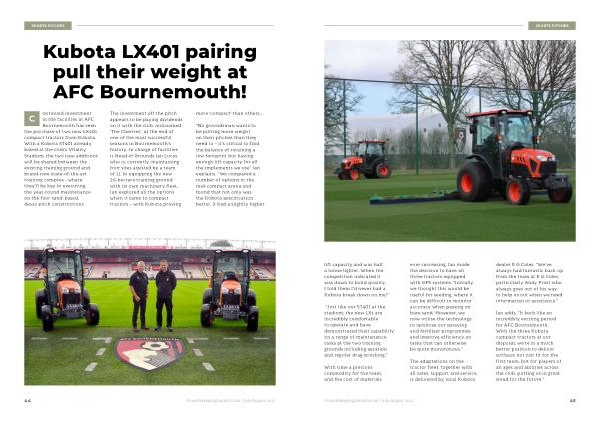 C in the facilities at AFC Bournemouth has seen the purchase of two new LX401 compact tractors from Kubota. With a Kubota ST401 already based at the club’ s Vitality Stadium, the two new additions will be shared between the existing training ground and brand-new state-of-the-art training complex- where they’ ll be key to executing the year-round maintenance on the four sand-based, desso pitch constructions.