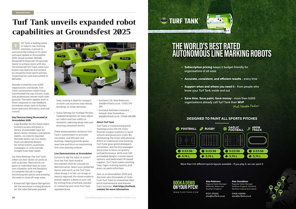 announce the release of its latest software update at Groundsfest 2025, Stand number OSA481. Designed to empower UK grounds teams to achieve more with less, the enhanced Turf Tank robot now boasts new features that extend its versatility from sports pitches to parking lots, and everywhere in between.