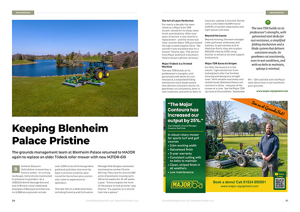 Major TDR Earns its Stripes For Rob, the reward is in the results:“ I get satisfaction from looking back after I’ ve finished mowing and seeing nice straight lines.” With reliable machinery and skilled hands, Blenheim Palace will continue to shine- one pass of the mower at a time. See the Major TDR up close at GroundsFest, September