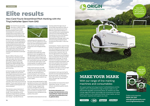 Today, Carel maintains over 100 pitches across his client base, and the robot is in on average five days a week. He uses Duraline Extra Concentrate paint, which he finds gives him“ white, clean, and crisp lines. The lines often remain visible for up to four weeks.”