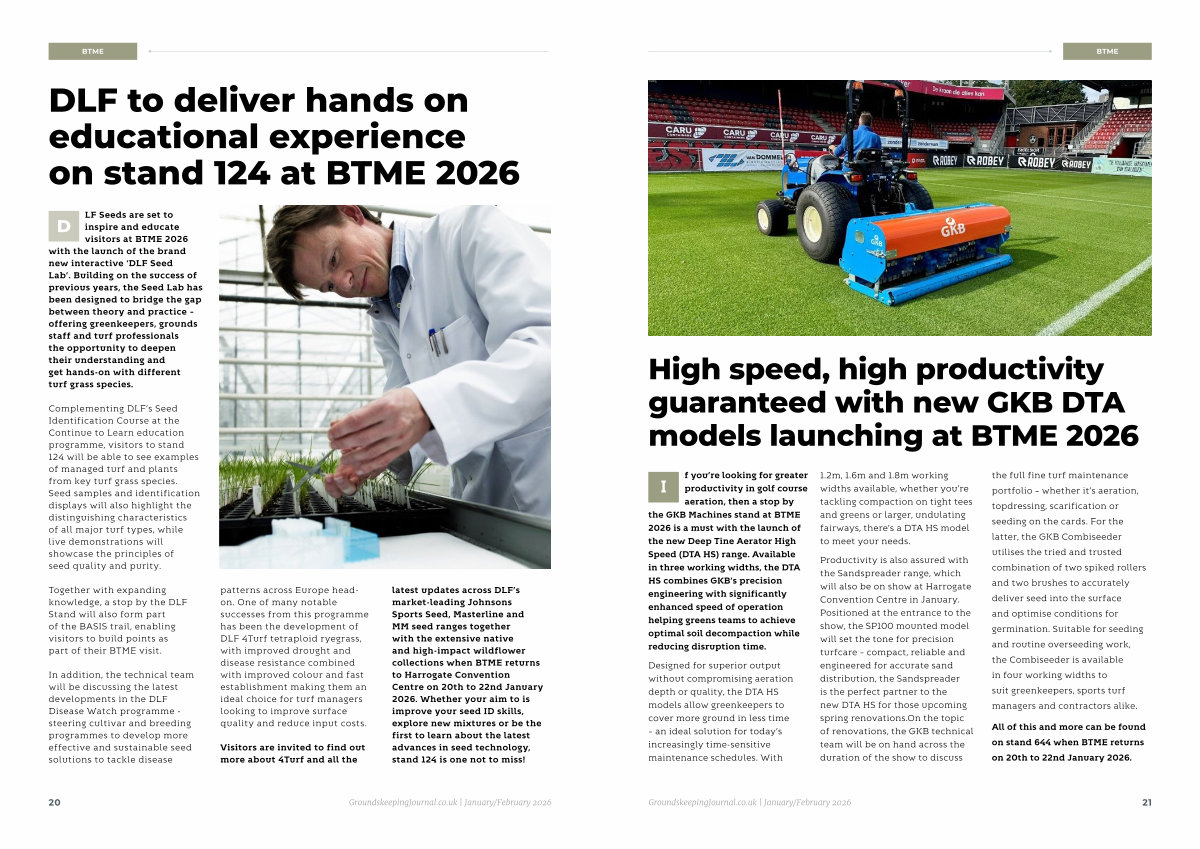 I f you’ re looking for greater productivity in golf course aeration, then a stop by the GKB Machines stand at BTME 2026 is a must with the launch of the new Deep Tine Aerator High Speed( DTA HS) range. Available in three working widths, the DTA HS combines GKB’ s precision engineering with significantly enhanced speed of operation helping greens teams to achieve optimal soil decompaction while reducing disruption time.