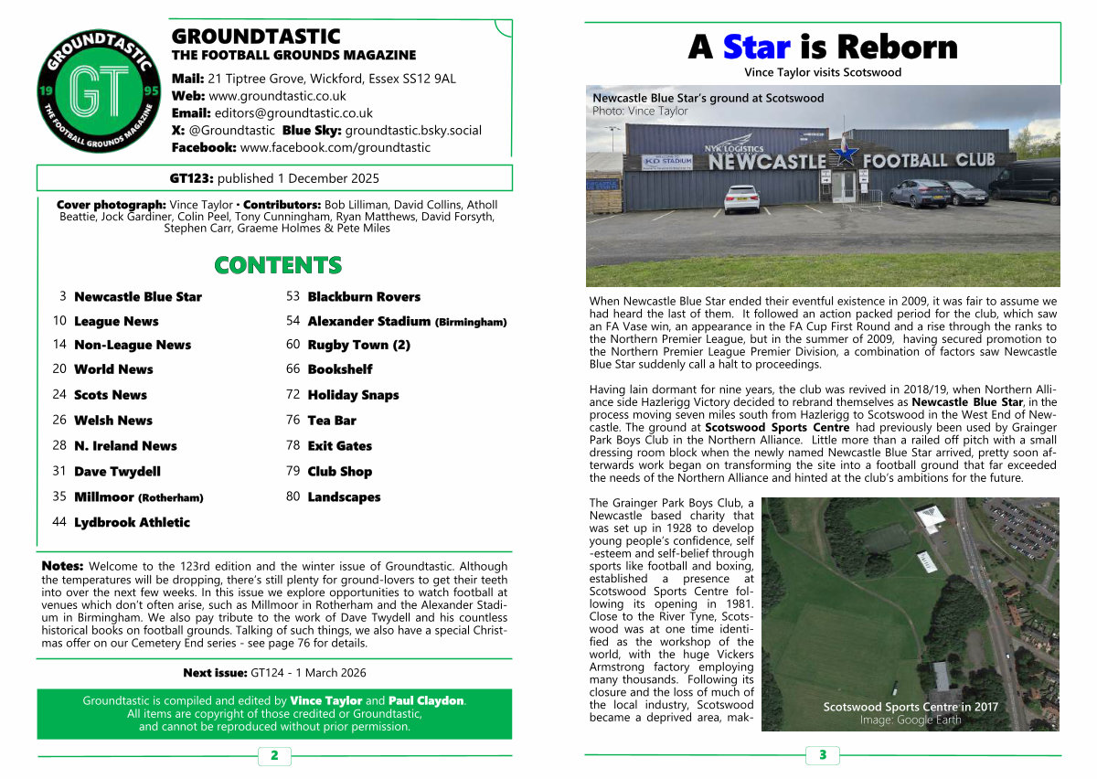 Notes: Welcome to the 123rd edition and the winter issue of Groundtastic. Although the temperatures will be dropping, there’ s still plenty for ground-lovers to get their teeth into over the next few weeks. In this issue we explore opportunities to watch football at venues which don’ t often arise, such as Millmoor in Rotherham and the Alexander Stadium in Birmingham. We also pay tribute to the work of Dave Twydell and his countless historical books on football grounds. Talking of such things, we also have a special Christmas offer on our Cemetery End series- see page 76 for details.