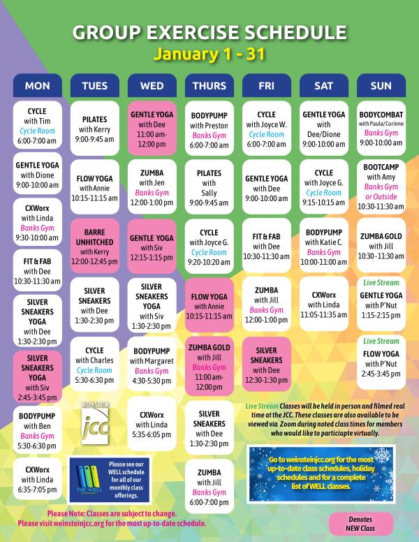 GROUP EXERCISE SCHEDULE January 1 - 31 MON TUES WED THURS FRI SAT SUN CYCLE with Tim Cycle Room 6:00-7:00 am PILATES with Kerry 9:00-9:45 am BODYPUMP with Preston Banks Gym 6:00-7:00 am CYCLE with Joyce W . Cycle Room 6:00-7:00 am CYCLE with Joyce G . Cycle Room 9:15-10:15 am BODYCOMBAT with Paula / Corinne Banks Gym 9:00-10:00 am GENTLE YOGA with Dione 9:00-10:00 am FLOW YOGA with Annie 10:15-11:15 am BODYPUMP with Margaret Banks Gym 4:30-5:30 pm PILATES with Sally 9:00-9:45 am BODYPUMP with Katie C . Banks Gym 10:00-11:00 am GENTLE YOGA with P ’ Nut 1:15-2:15 pm CXWorx with Linda Banks Gym 9:30-10:00 am SILVER SNEAKERS with Dee 1:30-2:30 pm CXWorx with Linda 5:35-6:05 pm CYCLE with Joyce G . Cycle Room 9:20-10:20 am FIT & FAB with Dee 10:30-11:30 am CXWorx with Linda 11:05-11:35 am FLOW YOGA with P ’ Nut 2:45-3:45 pm FIT & FAB with Dee 10:30-11:30 am ZUMBA with Jill Banks Gym 6:00-7:00 pm ZUMBA with Jill Banks Gym 12:00-1:00 pm SILVER SNEAKERS YOGA with Dee 1:30-2:30 pm Please Note : Classes are subject to change . Please visit weinsteinjcc . org for the most up-to-date schedule . GENTLE YOGA with Dee 9:00-10:00 am ZUMBA GOLD with Jill 10:30 - 11:30 am Live Stream Live Stream Live Stream Classes will be held in person and filmed real time at the JCC . These classes are also available to be viewed via Zoom during noted class times for members who would like to particiapte virtually . CYCLE with Charles Cycle Room 5:30-6:30 pm SILVER SNEAKERS YOGA with Siv 1:30-2:30 pm SILVER SNEAKERS with Dee 1:30-2:30 pm BOOTCAMP with Amy Banks Gym or Outside 10:30-11:30 am GENTLE YOGA with Dee / Dione 9:00-10:00 am GENTLE YOGA with Dee 11:00 am- 12:00 pm BODYPUMP with Ben Banks Gym 5:30-6:30 pm CXWorx with Linda 6:35-7:05 pm ZUMBA with Jen Banks Gym 12:00-1:00 pm Go to weinsteinjcc . org for the most up-to-date class schedules , holiday schedules and for a complete list of WELL classes . SILVER SNEAKERS YOGA with Siv 2:45-3:45 pm BARRE UNHITCHED with Kerry 12:00-12:45 pm FLOW YOGA with Annie 10:15-11:15 am ZUMBA GOLD with Jill Banks Gym 11:00 am- 12:00 pm SILVER SNEAKERS with Dee 12:30-1:30 pm Denotes NEW Class Please see our WELL schedule for all of our monthly class offerings . GENTLE YOGA with Siv 12:15-1:15 pm