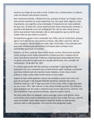 Sem nenhuma dúvida, o Mestre fez isso, porque se Deus na Criação coloca sete pontos centrais no corpo espiritual, ora, isso quer dizer alguma coisa importante, isso significa uma orientação. É impossível ser mais evidente do que isso. Se Deus diz: corpo espiritual tem esses sete pontos centrais, o que Ele está dizendo a um ser inteligente? Ah, são as sete coisas que eu tenho que prestar mais atenção, são os sete aspectos que eu tenho que cuidar mais do que todos os outros!