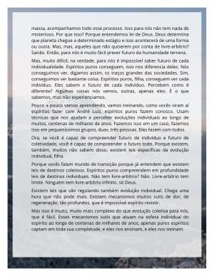 massa, acompanhamos todo esse processo. Isso para nós não tem nada de misterioso. Por que isso? Porque entendemos lei de Deus. Deus determina que planeta chegue a determinado estágio e isso acontecerá de uma forma ou outra. Mas, mas, aqueles que não quiserem por conta de livre-arbítrio? Sairão. Então, para nós é muito fácil prever futuro da humanidade terrena.