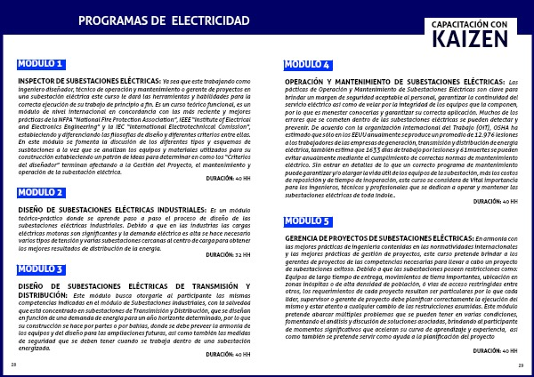 DISEÑO DE SUBESTACIONES ELÉCTRICAS INDUSTRIALES: Es un módulo teórico-práctico donde se aprende paso a paso el proceso de diseño de las subestaciones eléctricas industriales. Debido a que en las industrias las cargas eléctricas motoras son significantes y la demanda eléctrica es alta se hace necesario varios tipos de tensión y varias subestaciones cercanas al centro de carga para obtener los mejores resultados de distribución de la energía.