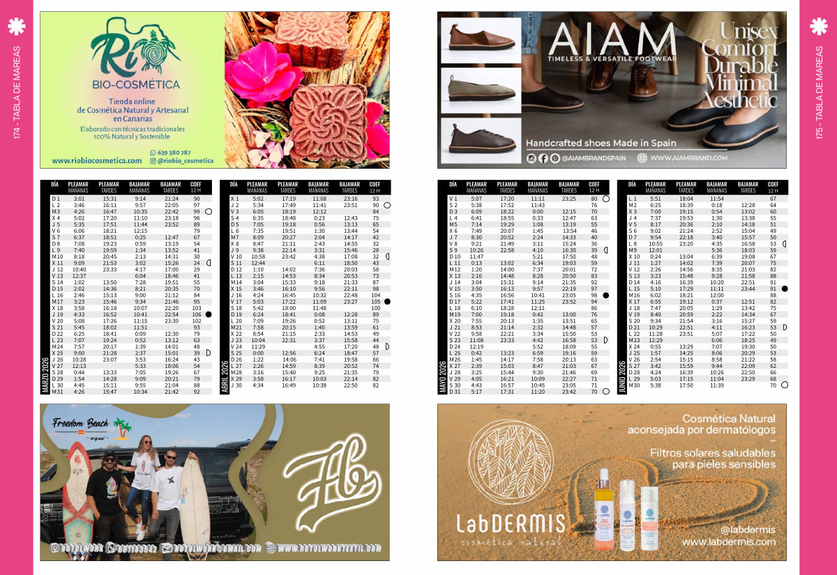 175- TABLA DE MAREAS 11:11 11:43 0:00 0:33 1:08 1:45 2:24 3:11 4:10 5:21 6:34 7:37 8:28 9:14 9:57 10:41 11:25 12:11 0:42 1:35 2:32 3:34 4:42 5:52 6:59 7:58 8:47 9:30 10:09 10:45 11:20 17:20 17:52 18:22 18:55 19:29 20:07 20:52 21:49 22:58 13:02 14:00 14:48 15:31 16:13 16:56 17:41 18:28 19:18 20:13 21:14 22:21 23:33 13:23 14:17 15:03 15:44 16:21 16:57 17:31 5:07 5:38 6:09 6:41 7:14 7:49 8:30 9:21 10:26 11:47 0:13 1:20 2:16 3:04 3:50 4:35 5:22 6:10 7:00 7:55 8:53 9:58 11:08 12:19 0:42 1:45 2:39 3:25 4:05 4:43 5:17 23:25 12:15 12:47 13:19 13:54 14:33 15:24 16:30 17:50 19:03 20:01 20:50 21:35 22:19 23:05 23:52 13:00 13:51 14:48 15:50 16:58 18:09 19:16 20:13 21:03 21:46 22:27 23:05 23:42 80 76 70 63 55 46 40 36 39 48 59 72 83 92 97 98 94 86 76 65 57 53 53 55 59 63 67 69 71 71 70 11:54 0:18 0:54 1:30 2:10 2:52 3:40 4:35 5:36 6:39 7:39 8:35 9:28 10:20 11:11 12:00 0:37 1:29 2:22 3:16 4:11 5:07 6:06 7:07 8:06 8:58 9:44 10:26 11:04 11:39 18:04 18:39 19:15 19:53 20:36 21:24 22:18 23:20 13:04 14:02 14:56 15:48 16:39 17:29 18:21 19:12 20:05 20:59 21:54 22:51 23:51 13:29 14:25 15:15 15:59 16:39 17:15 17:50 5:51 6:25 7:00 7:37 8:17 9:02 9:54 10:55 12:01 0:24 1:27 2:26 3:23 4:16 5:10 6:02 6:55 7:47 8:40 9:34 10:29 11:28 12:29 0:55 1:57 2:54 3:42 4:24 5:03 5:38 12:28 13:02 13:38 14:18 15:04 15:57 16:58 18:03 19:08 20:07 21:03 21:58 22:51 23:44 12:51 13:42 14:34 15:27 16:23 17:22 18:25 19:30 20:29 21:22 22:09 22:50 23:29 67 64 60 55 51 49 50 53 59 67 75 82 88 91 91 88 82 75 67 59 53 50 49 50 53 58 62 66 68 70 DÍA DÍA PLEAMAR MAÑANAS PLEAMAR MAÑANAS BAJAMAR MAÑANAS BAJAMAR MAÑANAS PLEAMAR TARDES PLEAMAR TARDES BAJAMAR TARDES BAJAMAR TARDES COEF 12 H COEF 12 H MAYO 2026 JUNIO 2026 L M X J V S D L M X J V S D L M X J V S D L M X J V S D L M 1 2 3 4 5 6 7 8 9 10 11 12 13 14 15 16 17 18 19 20 21 22 23 24 25 26 27 28 29 30 V S D L M X J V S D L M X J V S D L M X J V S D L M X J V S D 1 2 3 4 5 6 7 8 9 10 11 12 13 14 15 16 17 18 19 20 21 22 23 24 25 26 27 28 29 30 31