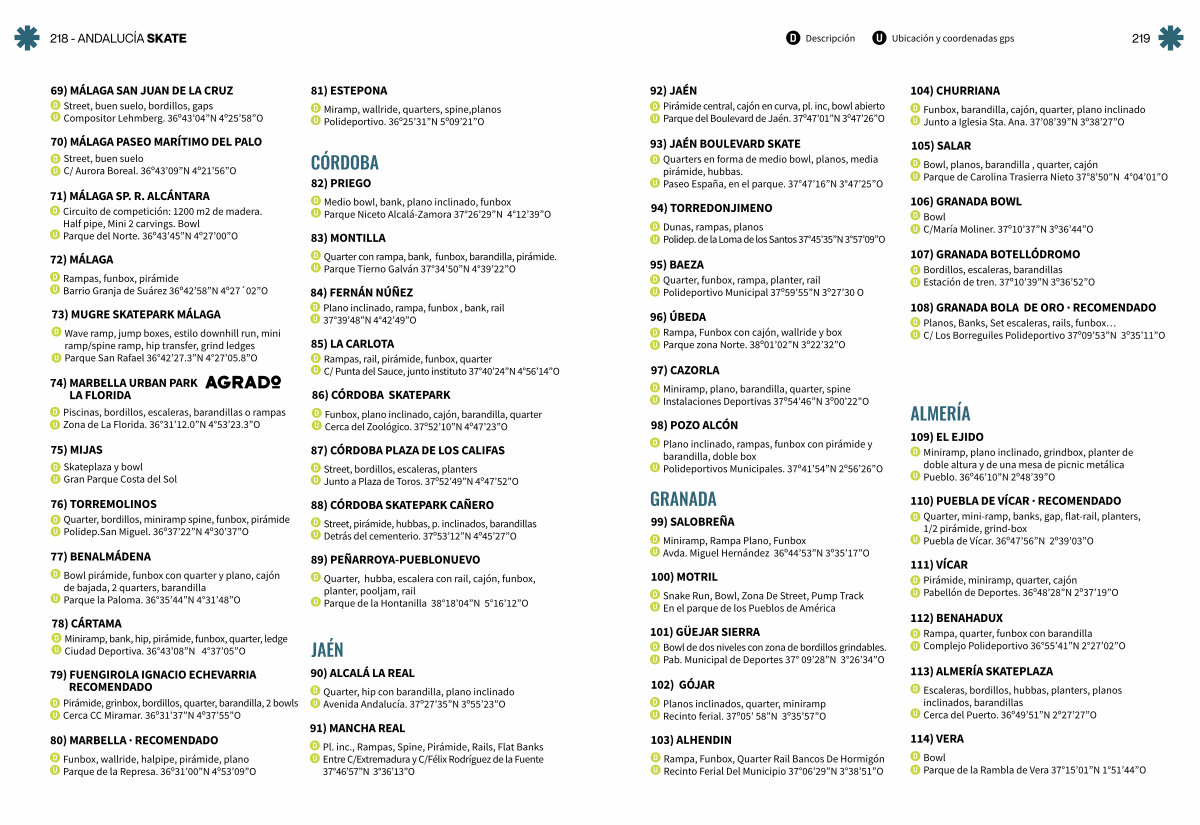 Quarter, mini-ramp, banks, gap, flat-rail, planters, 1 / 2 pirámide, grind-box Puebla de Vícar. 36 º 47’ 56” N 2 º 39’ 03” O