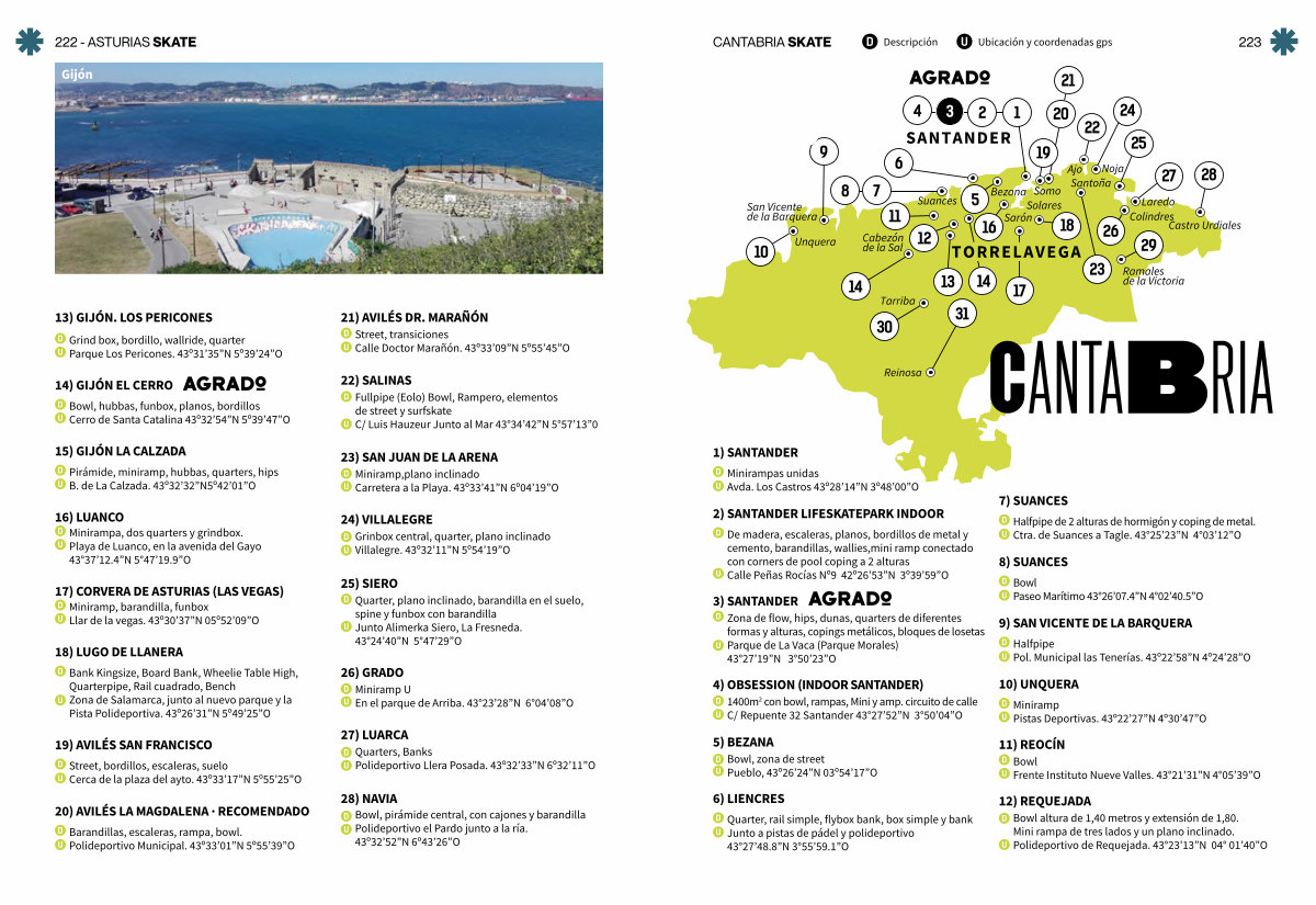 Bank Kingsize, Board Bank, Wheelie Table High, Quarterpipe, Rail cuadrado, Bench Zona de Salamarca, junto al nuevo parque y la Pista Polideportiva. 43 º 26’ 31” N 5 º 49’ 25” O