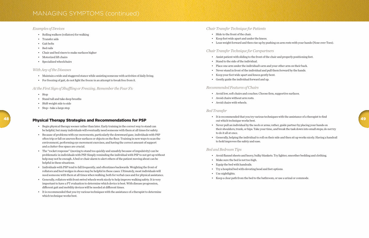 • Because of problems with eye movements, particularly the downward gaze, individuals with PSP often trip or fall on uneven floor surfaces or objects on the floor. Training in new ways to scan the environment, performing eye movement exercises, and having the correct amount of support and a clutter-free space are crucial.