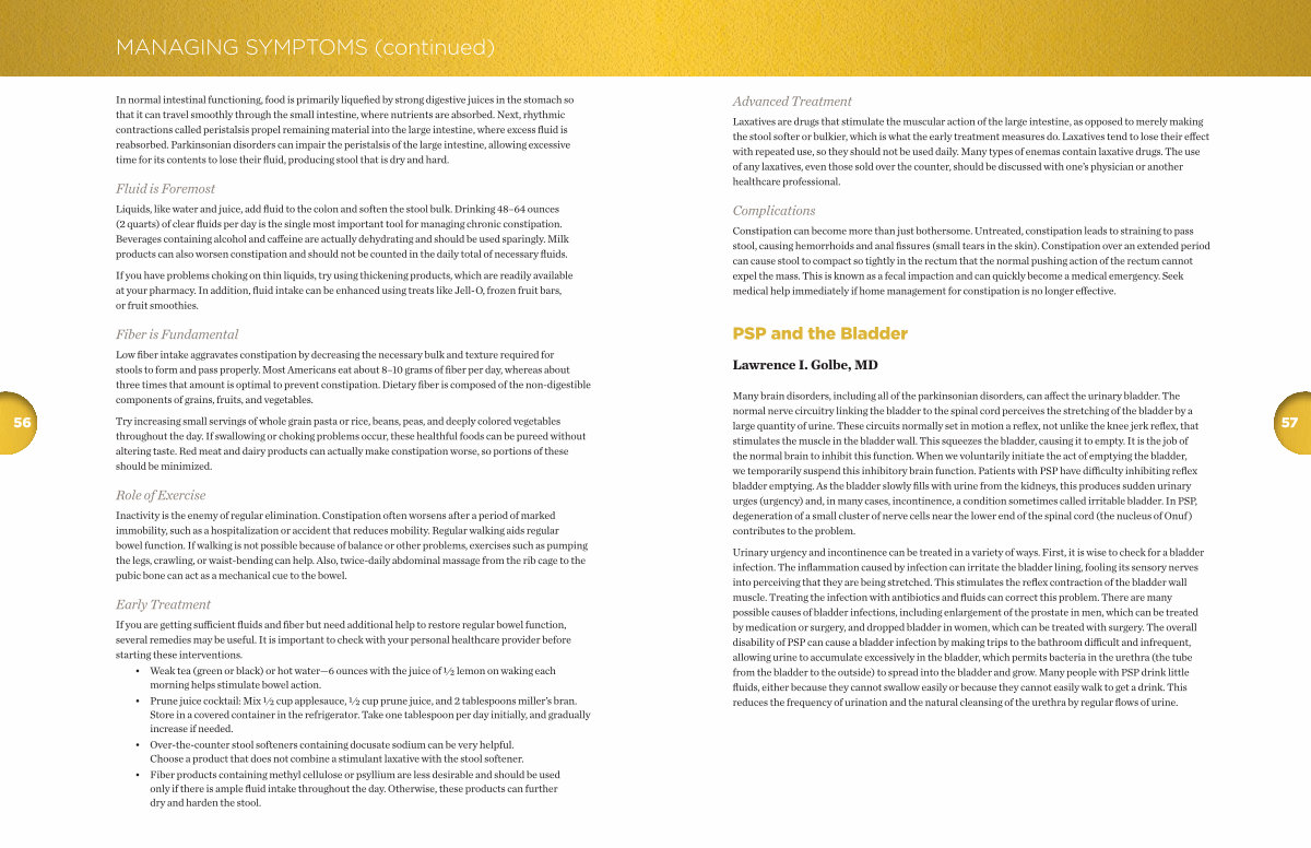 In normal intestinal functioning, food is primarily liquefied by strong digestive juices in the stomach so that it can travel smoothly through the small intestine, where nutrients are absorbed. Next, rhythmic contractions called peristalsis propel remaining material into the large intestine, where excess fluid is reabsorbed. Parkinsonian disorders can impair the peristalsis of the large intestine, allowing excessive time for its contents to lose their fluid, producing stool that is dry and hard.