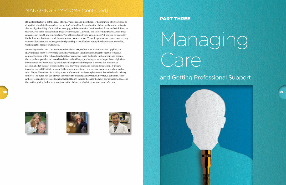 Some drugs used to treat the movement disorder of PSP, such as amantadine and amitriptyline, can share this side effect of worsening the urinary difficulty. Incontinence during the night is especially common because of the reduced availability of a caregiver to aid the trip to the bathroom and because the recumbent position increases blood flow to the kidneys, producing more urine per hour. Nighttime incontinence can be reduced by avoiding drinking fluids after supper. However, this must not be accomplished at the cost of reducing the total daily fluid intake and causing dehydration. If urinary incontinence in PSP fails to respond to these measures, it may be necessary to use an absorbent pad or adult diaper. The advice of a visiting nurse is often useful in choosing between this method and a urinary catheter. The nurse can also provide instruction in avoiding skin irritation. For men, a condom( Texas) catheter is usually preferable to an indwelling( Foley) catheter because the latter allows bacteria to ascend the urethra, giving the bacteria a surface in the bladder on which to grow and cause infection.