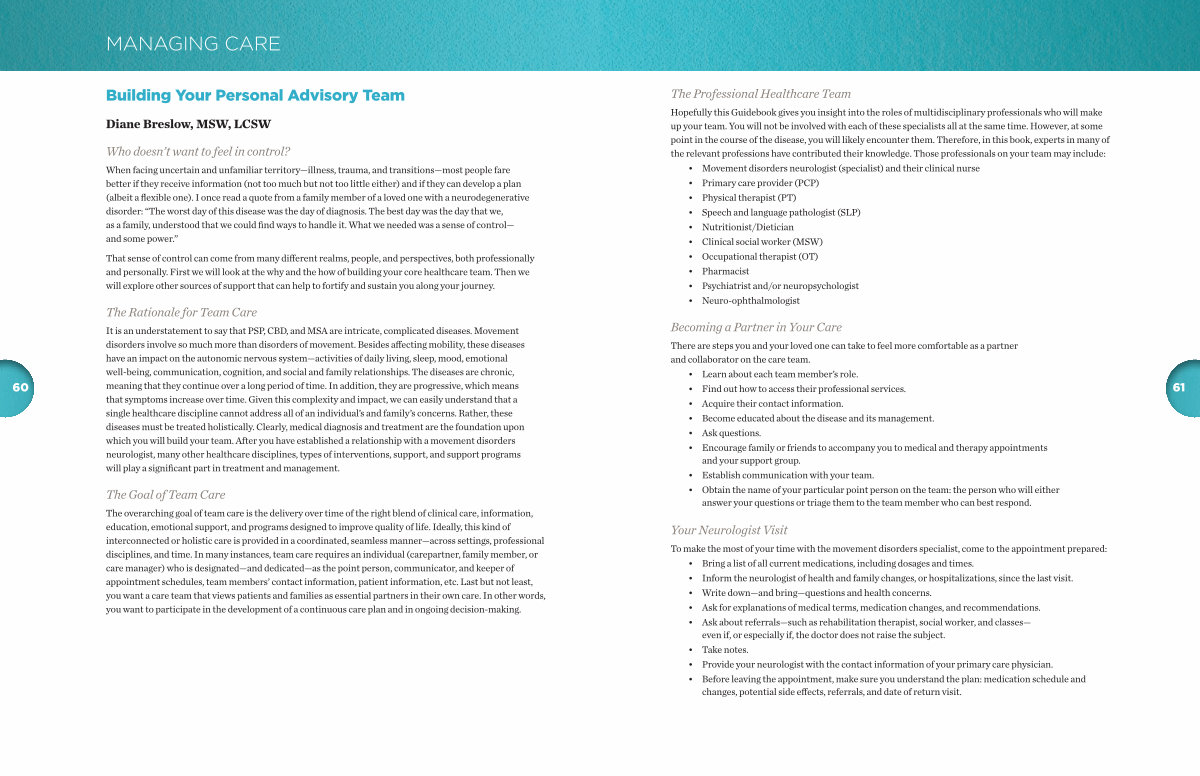 It is an understatement to say that PSP, CBD, and MSA are intricate, complicated diseases. Movement disorders involve so much more than disorders of movement. Besides affecting mobility, these diseases have an impact on the autonomic nervous system— activities of daily living, sleep, mood, emotional well-being, communication, cognition, and social and family relationships. The diseases are chronic, meaning that they continue over a long period of time. In addition, they are progressive, which means that symptoms increase over time. Given this complexity and impact, we can easily understand that a single healthcare discipline cannot address all of an individual’ s and family’ s concerns. Rather, these diseases must be treated holistically. Clearly, medical diagnosis and treatment are the foundation upon which you will build your team. After you have established a relationship with a movement disorders neurologist, many other healthcare disciplines, types of interventions, support, and support programs will play a significant part in treatment and management.