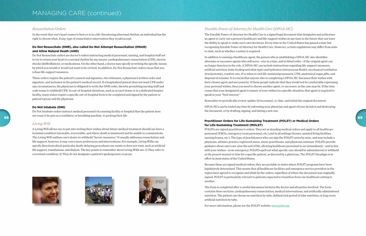 A Living Will allows one to put into writing their wishes about future medical treatment should one have a terminal condition( incurable, irreversible, and where death is imminent) and be unable to communicate. The Living Will outlines one’ s desire to withhold“ heroic measures.” It usually addresses resuscitation and life support; however, it may cover more preferences and interventions. For example, Living Wills can specify directions about particular death-delaying procedures one wants or does not want, such as artificial life support, transfusions, and dialysis. The key points to remember about Living Wills are: 1) They refer to a terminal condition; 2) They do not designate a patient’ s spokesperson or proxy.