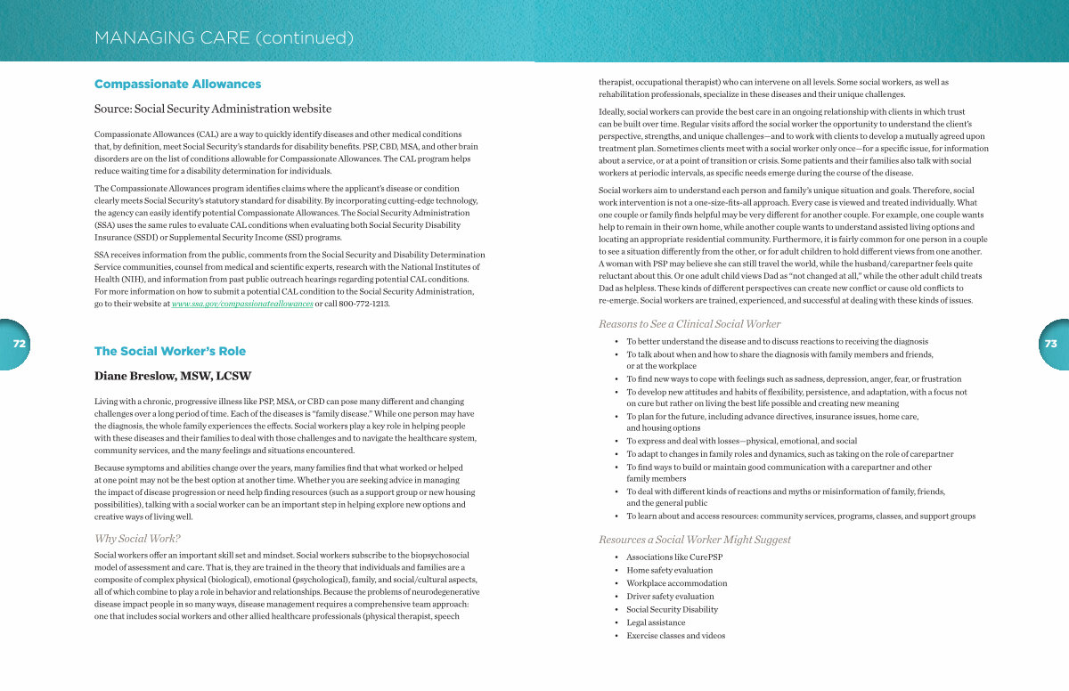 Compassionate Allowances( CAL) are a way to quickly identify diseases and other medical conditions that, by definition, meet Social Security’ s standards for disability benefits. PSP, CBD, MSA, and other brain disorders are on the list of conditions allowable for Compassionate Allowances. The CAL program helps reduce waiting time for a disability determination for individuals.