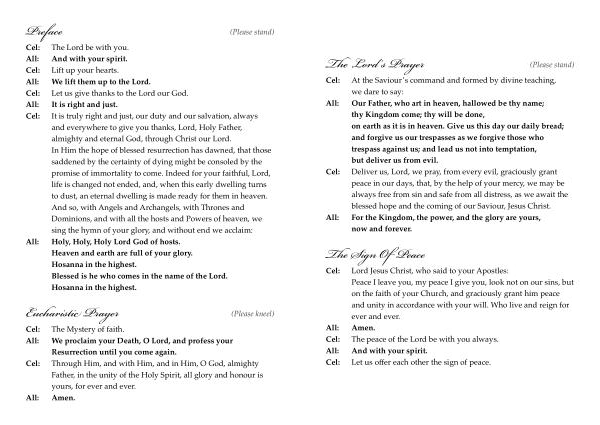 Cel : The Lord be with you . All : And with your spirit . Cel : Lift up your hearts . All : We lift them up to the Lord . Cel : Let us give thanks to the Lord our God . All : It is right and just . Cel : It is truly right and just , our duty and our salvation , always and everywhere to give you thanks , Lord , Holy Father , almighty and eternal God , through Christ our Lord . In Him the hope of blessed resurrection has dawned , that those saddened by the certainty of dying might be consoled by the promise of immortality to come . Indeed for your faithful , Lord , life is changed not ended , and , when this early dwelling turns to dust , an eternal dwelling is made ready for them in heaven . And so , with Angels and Archangels , with Thrones and Dominions , and with all the hosts and Powers of heaven , we sing the hymn of your glory , and without end we acclaim :