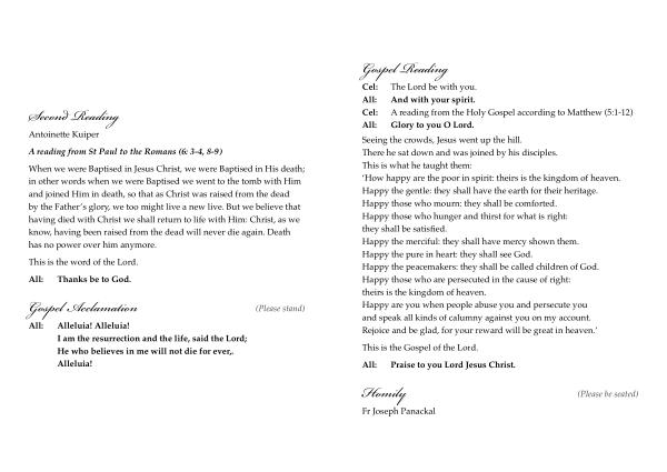 Cel : The Lord be with you . All : And with your spirit . Cel : A reading from the Holy Gospel according to Matthew ( 5:1-12 ) All : Glory to you O Lord . Seeing the crowds , Jesus went up the hill . There he sat down and was joined by his disciples . This is what he taught them : ‘ How happy are the poor in spirit : theirs is the kingdom of heaven . Happy the gentle : they shall have the earth for their heritage . Happy those who mourn : they shall be comforted . Happy those who hunger and thirst for what is right : they shall be satisfied . Happy the merciful : they shall have mercy shown them . Happy the pure in heart : they shall see God . Happy the peacemakers : they shall be called children of God . Happy those who are persecuted in the cause of right : theirs is the kingdom of heaven . Happy are you when people abuse you and persecute you and speak all kinds of calumny against you on my account . Rejoice and be glad , for your reward will be great in heaven .’