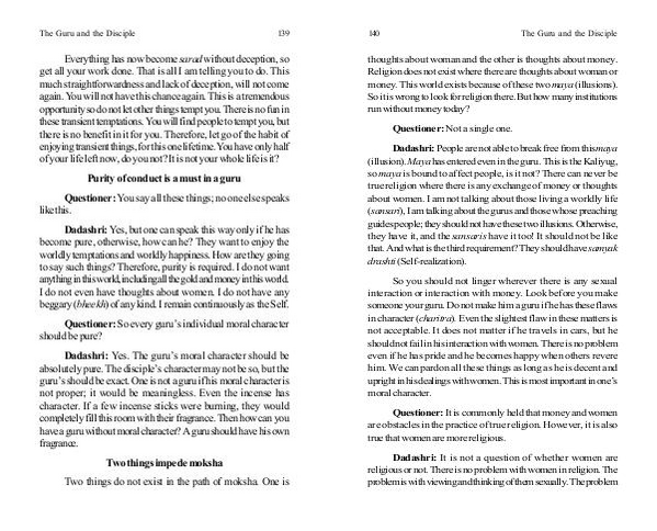 So you should not linger wherever there is any sexual interaction or interaction with money. Look before you make someone your guru. Do not make him a guru if he has these flaws in character( charitra). Even the slightest flaw in these matters is not acceptable. It does not matter if he travels in cars, but he should not fail in his interaction with women. There is no problem even if he has pride and he becomes happy when others revere him. We can pardon all these things as long as he is decent and upright in his dealings with women. This is most important in one’ s moral character.
