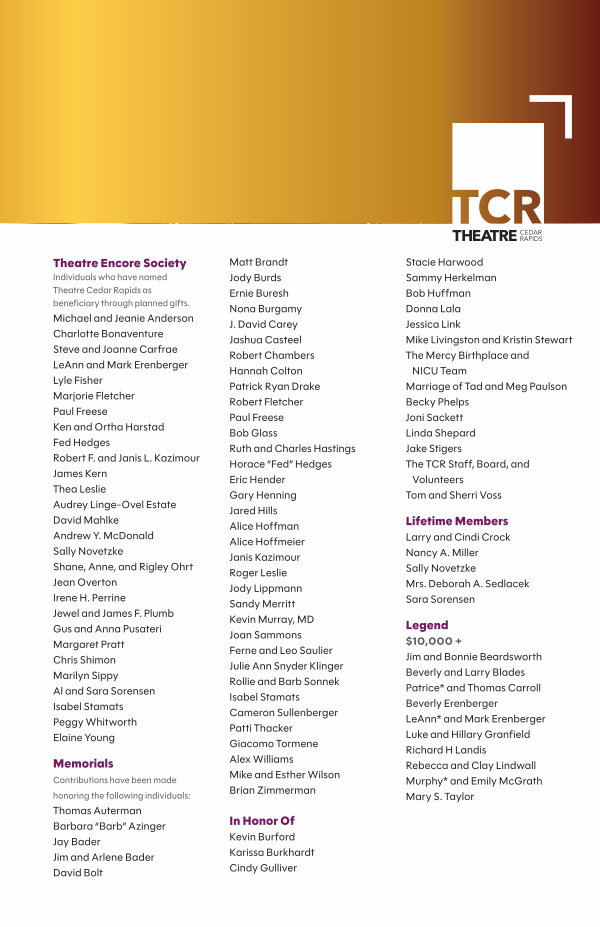 Individuals who have named Theatre Cedar Rapids as beneficiary through planned gifts. Michael and Jeanie Anderson Charlotte Bonaventure Steve and Joanne Carfrae LeAnn and Mark Erenberger Lyle Fisher Marjorie Fletcher Paul Freese Ken and Ortha Harstad Fed Hedges Robert F. and Janis L. Kazimour James Kern Thea Leslie Audrey Linge-Ovel Estate David Mahlke Andrew Y. McDonald Sally Novetzke Shane, Anne, and Rigley Ohrt Jean Overton Irene H. Perrine Jewel and James F. Plumb Gus and Anna Pusateri Margaret Pratt Chris Shimon Marilyn Sippy Al and Sara Sorensen Isabel Stamats Peggy Whitworth Elaine Young