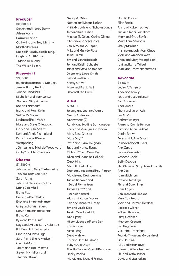 Playwright $ 2,500 + Richard and Barbara Donohue Jan and Larry Helling Joanne Hendricks Michelle * and Mark Jensen Alan and Virginia Jensen Robert Kazimour * Ingrid and Peter Kolln Wilma McGrane Linda and Paul Muhly Mary and Steve Odegaard Gary and Susie Streit * Kurt and Angie Tjelmeland Dr. Jeffrey and Denise Westpheling J Duncan and Michele Woodward Cathy * and Ken Terukina