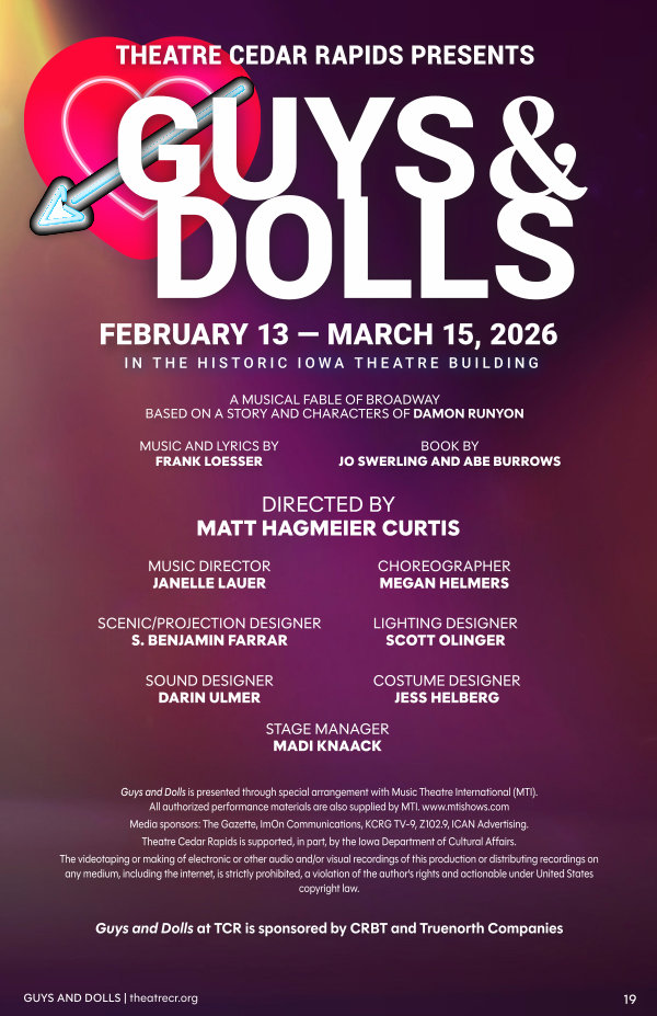 Guys and Dolls is presented through special arrangement with Music Theatre International( MTI). All authorized performance materials are also supplied by MTI. www. mtishows. com Media sponsors: The Gazette, ImOn Communications, KCRG TV-9, Z102.9, ICAN Advertising. Theatre Cedar Rapids is supported, in part, by the Iowa Department of Cultural Affairs. The videotaping or making of electronic or other audio and / or visual recordings of this production or distributing recordings on any medium, including the internet, is strictly prohibited, a violation of the author ' s rights and actionable under United States copyright law.