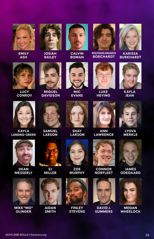 LUCY CONROY MIGUEL DAVIDSON MIC EVANS LUKE HEYING KAYLA JEAN EMILY ASH JOSIAH BAILEY CALVIN BOMAN WOLFGANG AMADEUS BORCHARDT KARISSA BURKHARDT KAYLA LANSING-GREEN SAMUEL LARSON SHAY LARSON ANN LAWRENCE LYOVA MERKLE MIKE“ MO” OLINGER AIDAN SMITH FINLEY STEVENS DAVID J. SUMMERS MEGAN WHEELOCK DEAN MESSERLY EJ MILLER ZOE MURPHY CONNOR NORFLEET JAMES ODEGAARD GUYS AND DOLLS | theatrecr. org 23