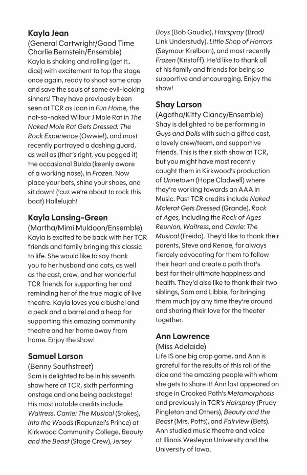 Shay Larson( Agatha / Kitty Clancy / Ensemble) Shay is delighted to be performing in Guys and Dolls with such a gifted cast, a lovely crew / team, and supportive friends. This is their sixth show at TCR, but you might have most recently caught them in Kirkwood’ s production of Urinetown( Hope Cladwell) where they’ re working towards an AAA in Music. Past TCR credits include Naked Molerat Gets Dressed( Grande), Rock of Ages, including the Rock of Ages Reunion, Waitress, and Carrie: The Musical( Freida). They’ d like to thank their parents, Steve and Renae, for always fiercely advocating for them to follow their heart and create a path that’ s best for their ultimate happiness and health. They’ d also like to thank their two siblings, Sam and Libbie, for bringing them much joy any time they’ re around and sharing their love for the theater together.